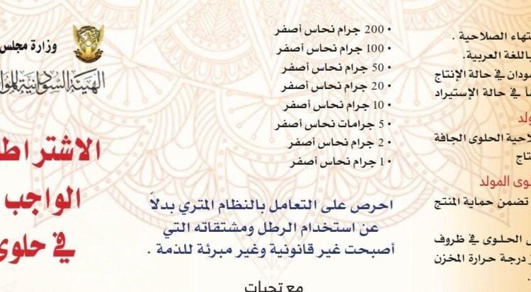 أطلقت الهيئة السودانية للمواصفات والمقاييس حملتها القومية الحادية عشرة لتوعية المستهلك بموسم المولد النبوي الشريف 1447هـ، في وقت أكدت فيه أن الرقابة ستشمل ضبط الأوزان المخالفة والتأكد من مطابقة “حلوى المولد” للاشتراطات الفنية المعتمدة.