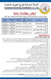 إعلان عطاءات عامة/ الشركة السودانية لتوزيع الكهرباء المحدودة Sudanese Electricity Distribution Co. Ltd