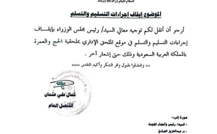 > “أرجو أن أنقل لكم توجيه معالي السيد رئيس مجلس الوزراء بإيقاف إجراءات التسليم والتسلم في موقع الملحق الإداري بملحقية الحج والعمرة بالمملكة العربية السعودية، وذلك حتى إشعار آخر.”