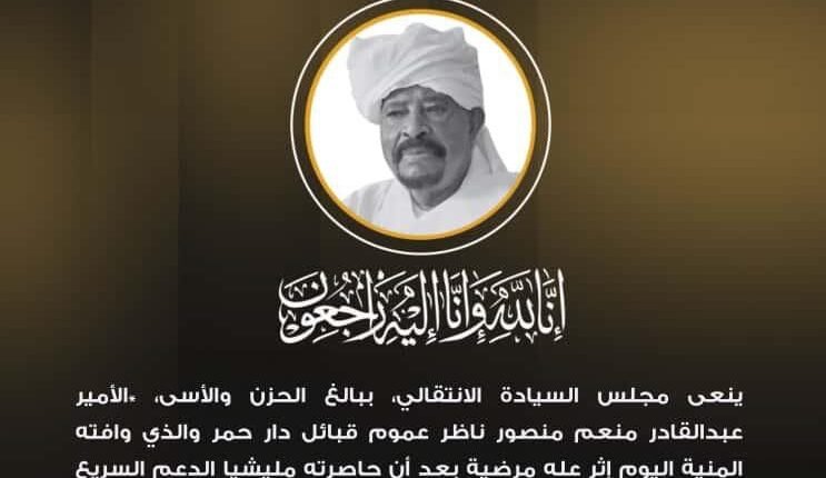 ينعى *مجلس السيادة الانتقالي*، ببالغ الحزن والأسى، *الأمير عبدالقادر منعم منصور* ناظر عموم قبائل دار حمر والذي وافته المنية اليوم إثر عله مرضية بعد أن حاصرته مليشيا الدعم السريع الإرهابية المتمردة وقيدت حركته ومنعته من العلاج والإستشفاء خارج مدينة النهود.