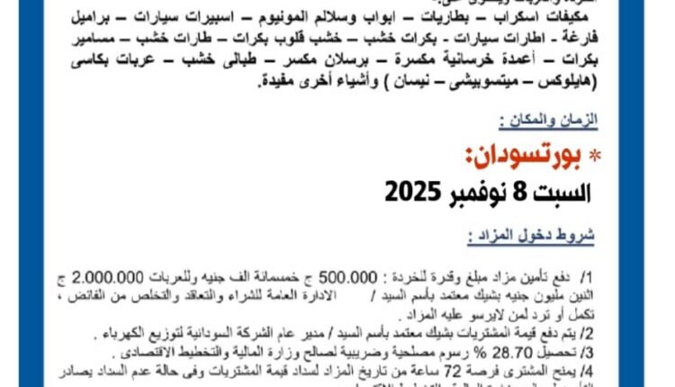 الشركة السودانية لتوزيع الكهرباء المحدودة. (إعــــــــــــلان) عن بيع أصناف مختلفة بالمزاد العلني