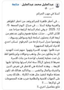 في واحدة من أخطر الجرائم التي شهدتها ولاية كسلا خلال الفترة الأخيرة، فقد أورد الصحفي المعروف عبد الجليل على صفحته بالفيس بوك اليوم عن تعرّض منزل أسرة نازحة من الخرطوم لهجوم مسلح فجر الجمعة 5 نوفمبر 2025، عند الساعة الرابعة صباحًا بالتزامن مع الأذان الثاني، وذلك في أحد الأحياء الشرقية المعروفة بالمدينة.