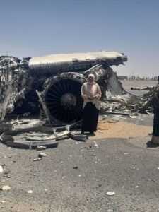 الصحفية ابتسام الشيخ امام حطام الطائرة السعودية
