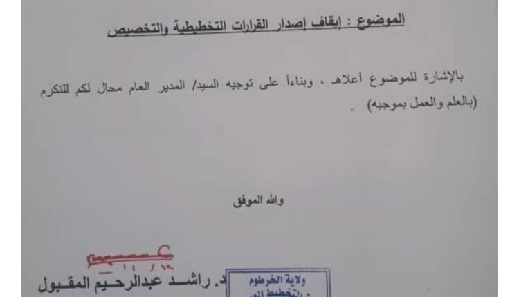 طلب المندوب تخليص إجراءات بيع قطعة الأرض، غير أن مدير الأراضي أبلغه بتوقف جميع إجراءات بيع الأراضي الاستثمارية، استناداً إلى قرار مكتوب صادر عن والي الخرطوم أحمد عثمان حمزة. وبحسب الشهود، غادر المندوب المكتب دون إتمام الإجراء.