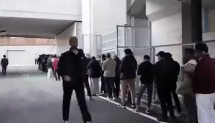 في الصورة طابور كبير من المصلين ينتظرون دورهم للصلاة …